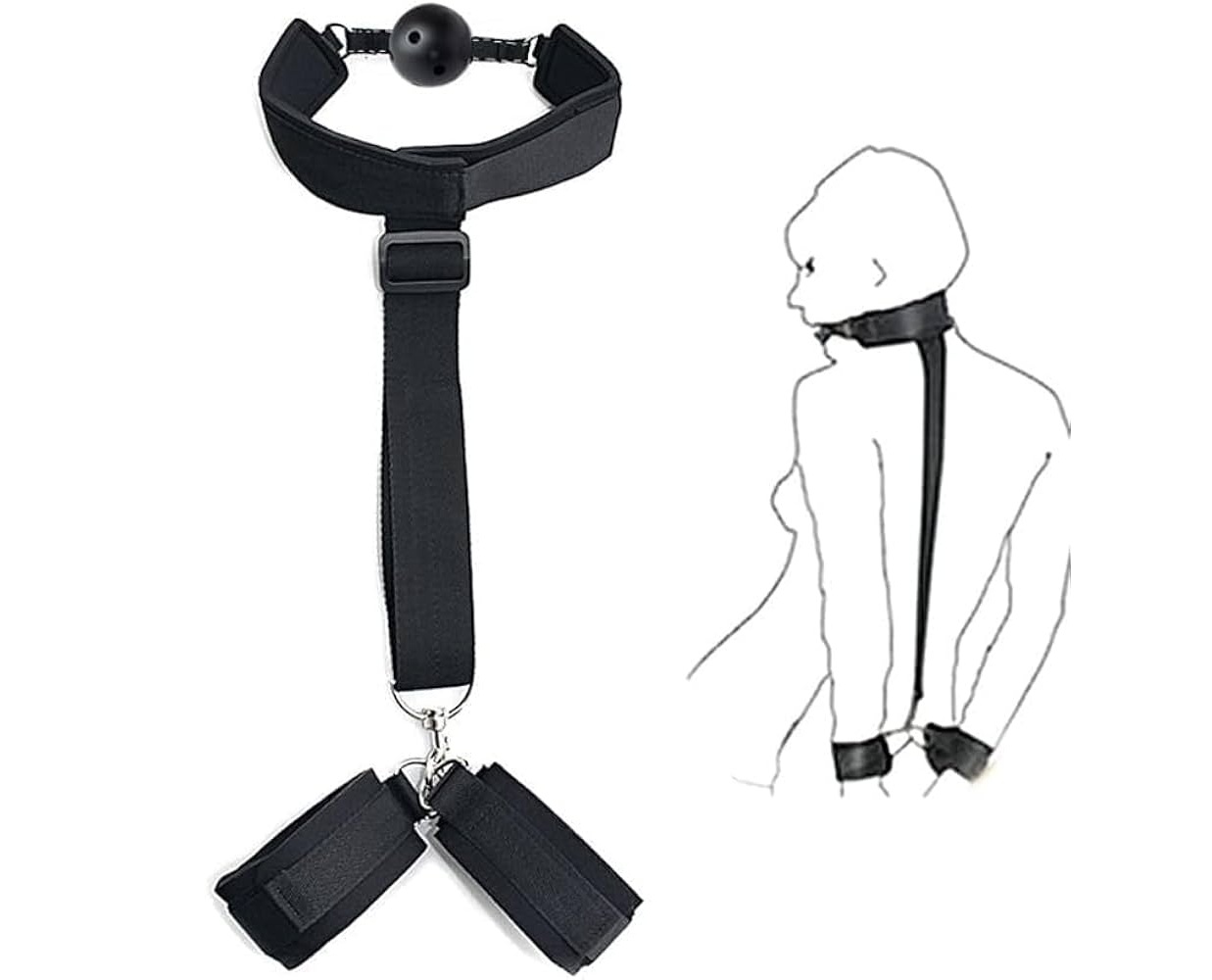 Mouthgag-to-Cuff Restraint: A durable strap connects the collar on the neck to the wrist cuffs placed behind the back. This restricts arm movement, locks the arms in a vulnerable position, and creates a visual line of submission.
