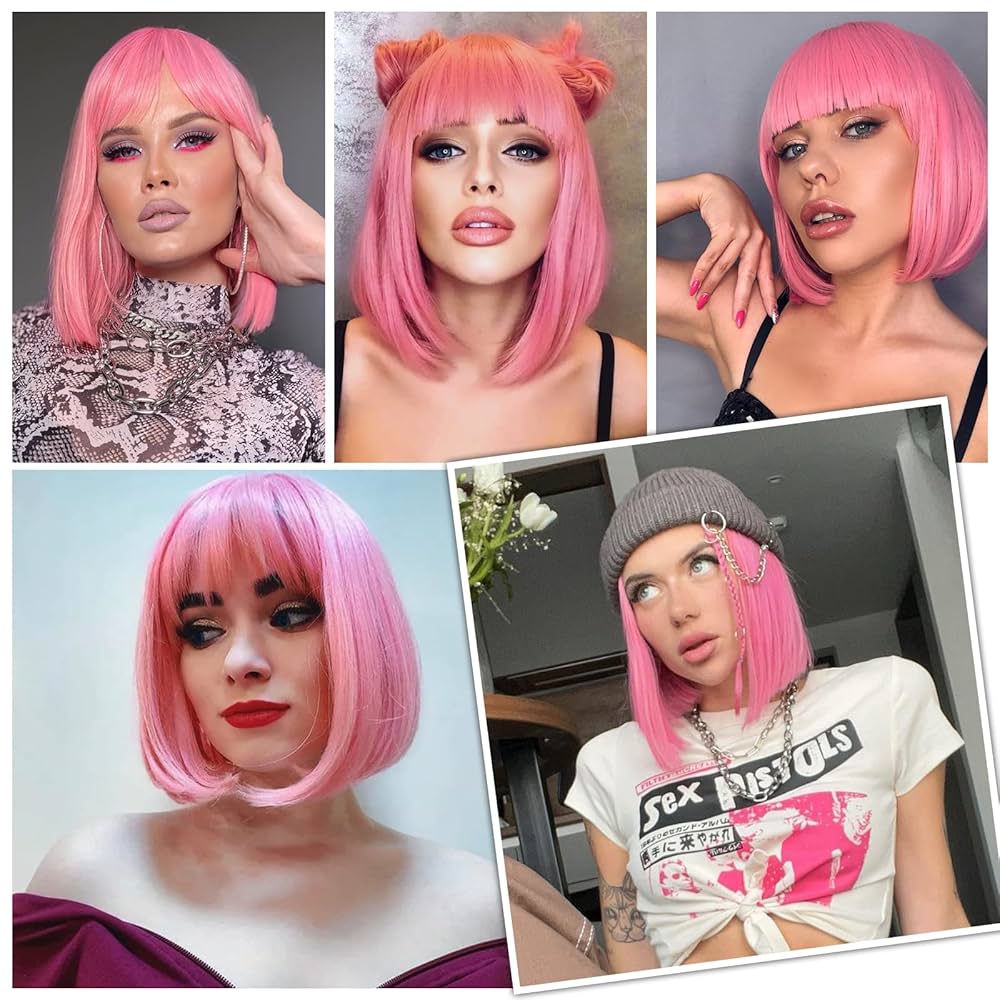 Step into bold style with this eye-catching pink bob wig, perfect for adding a playful pop of color to your look. Featuring a sleek, straight cut with full bangs and a natural-looking shine, this synthetic wig is both lightweight and comfortable to wear. Whether you’re dressing up for cosplay, a party, or just switching up your style, this vibrant wig delivers instant glam with minimal effort.