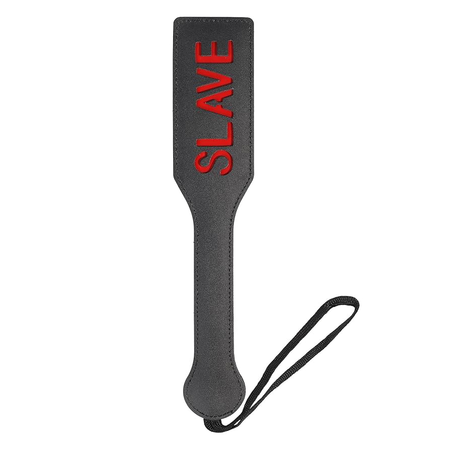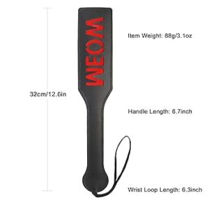Durable faux leather spanking paddle with bold ‘WOW’ cutout design. Features a secure wrist loop and ergonomic handle for safe, controlled play.